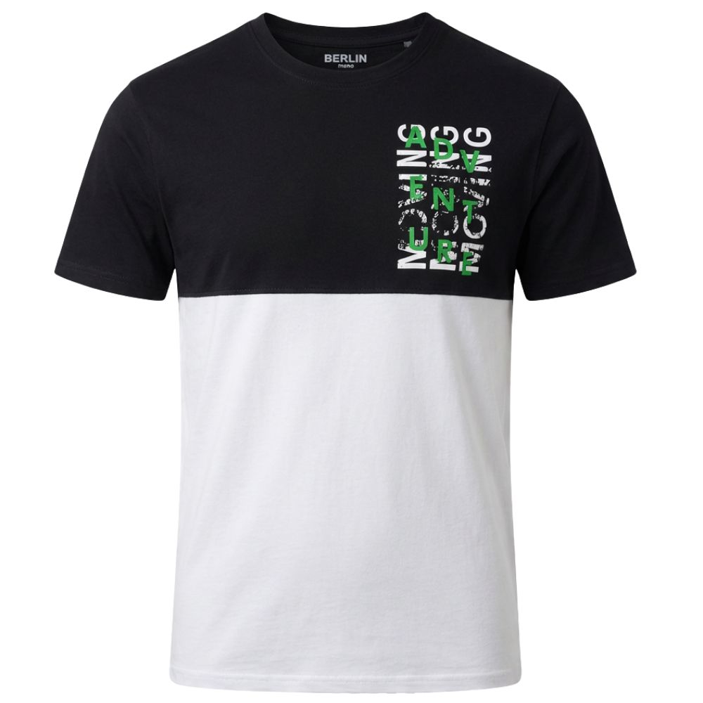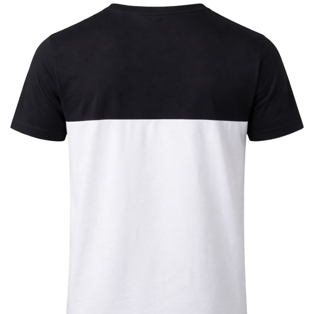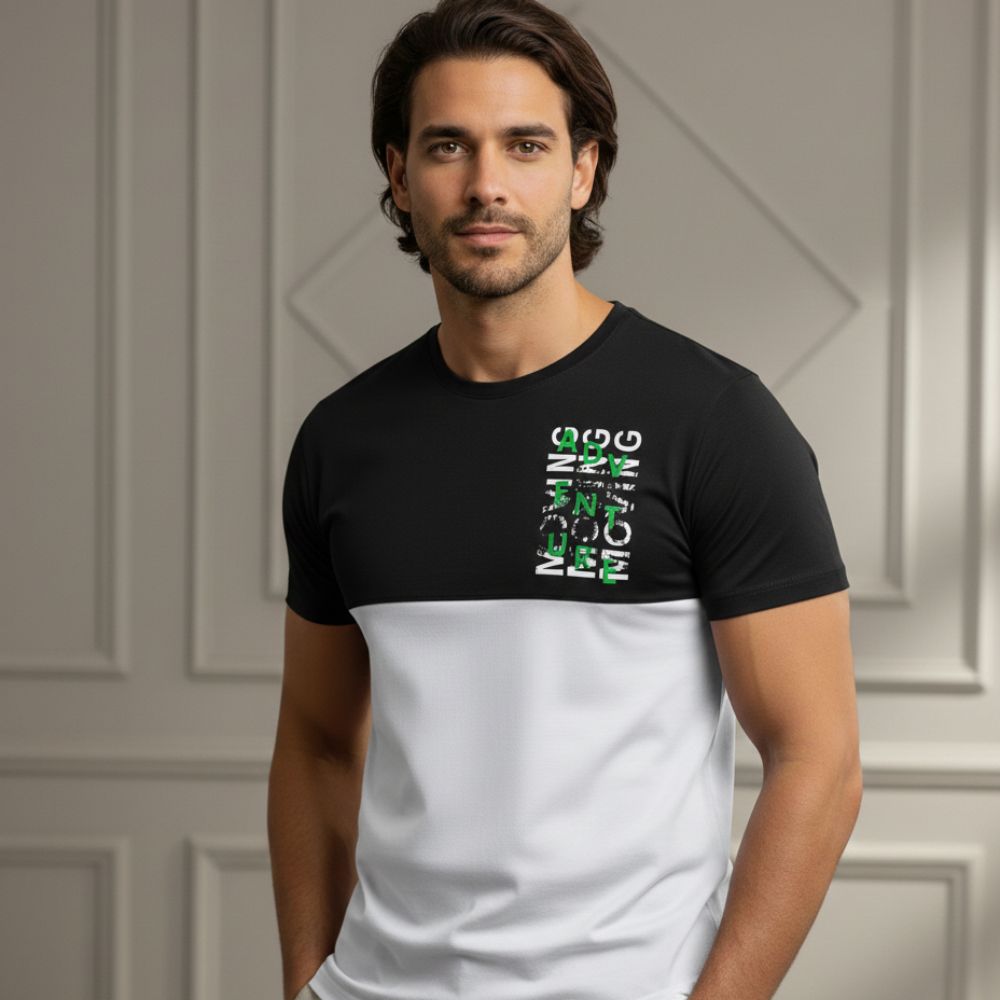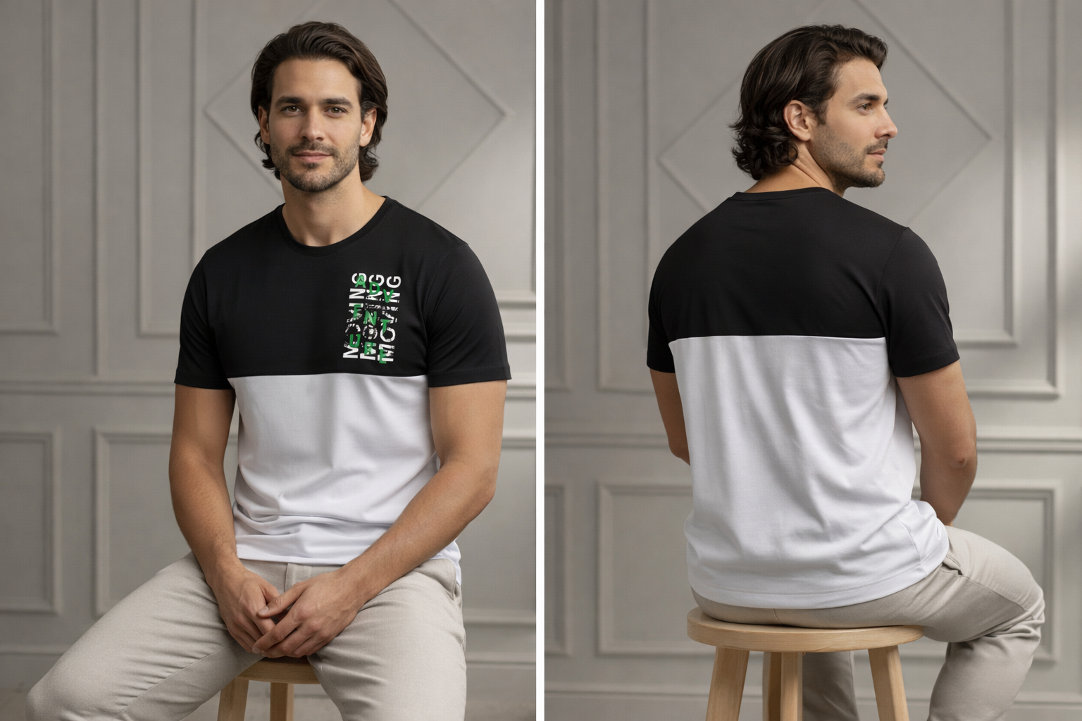 Master the art of minimalist streetwear with this striking Dual-Tone t-shirt. Designed with a bold horizontal color-block aesthetic, the top half features a deep Solid Black while the bottom half contrasts sharply in Crisp White. A unique, vertical typography graphic on the chest adds a modern, artistic touch to this classic silhouette.